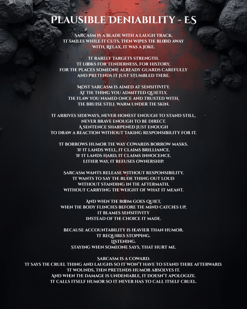 E.S. writes poetry and fiction for people who survived by adapting until it became a personality. Their work lives in the aftermath, examining quiet violence, emotional endurance, and the damage that forms when survival is mistaken for strength. These are not healing stories so much as psychological autopsies of love, power, and attachment. The tone is dark, restrained, and unsettling in a way that lingers rather than explodes. This work is for anyone who stayed too long, learned too much, and refuses to romanticize what it cost.